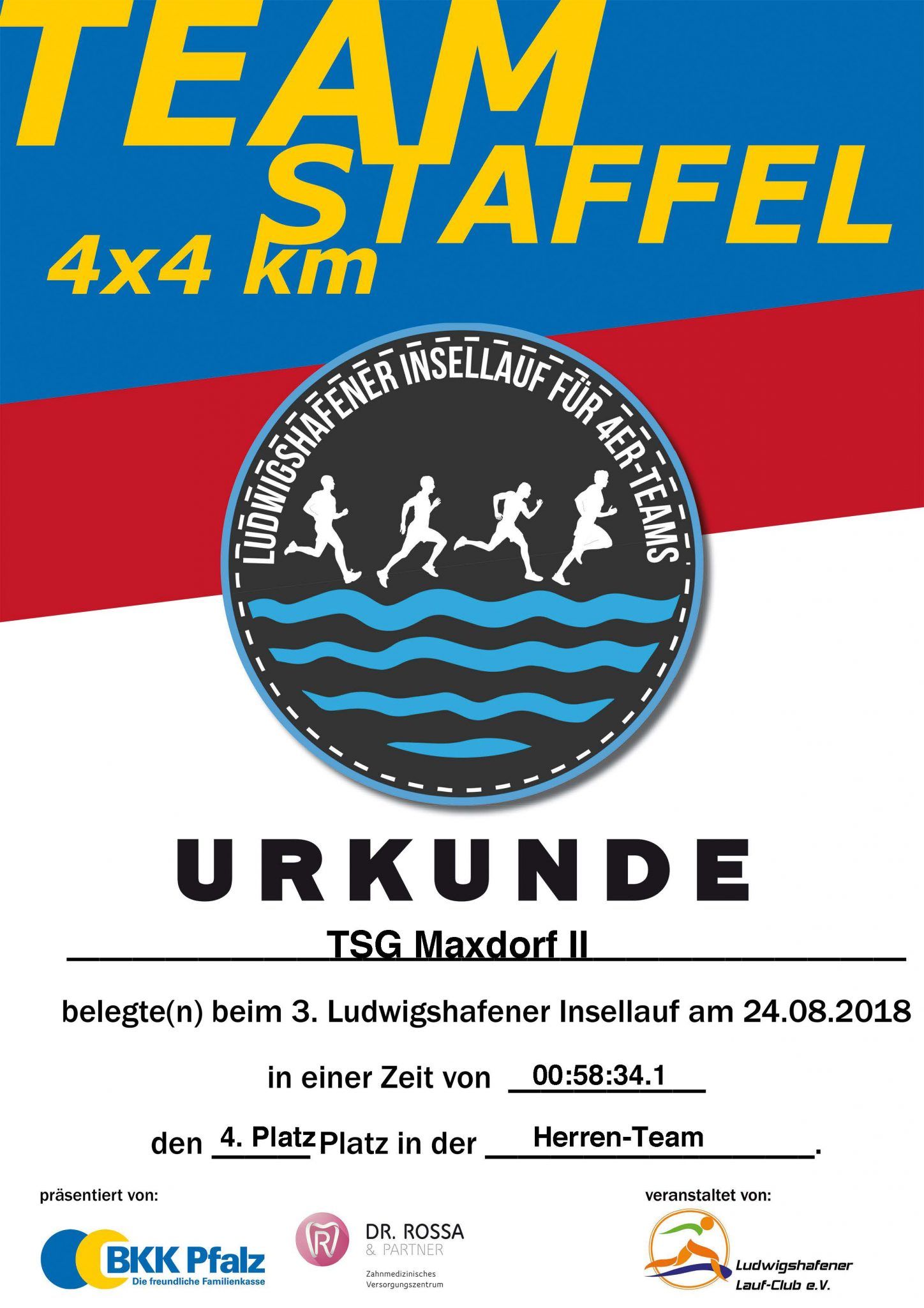 Urkunde 3. Ludwigshafener Parkinsel-Lauf 2018, 4er Staffel TSG Maxdorf