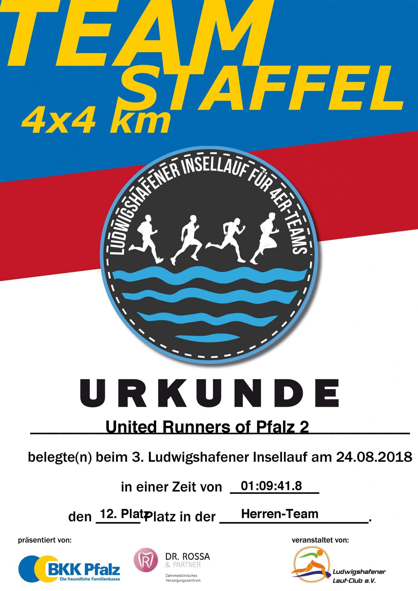 Urkunde 3. Ludwigshafener Parkinsel-Lauf 2018, 4er Staffel United Runners of Pfalz