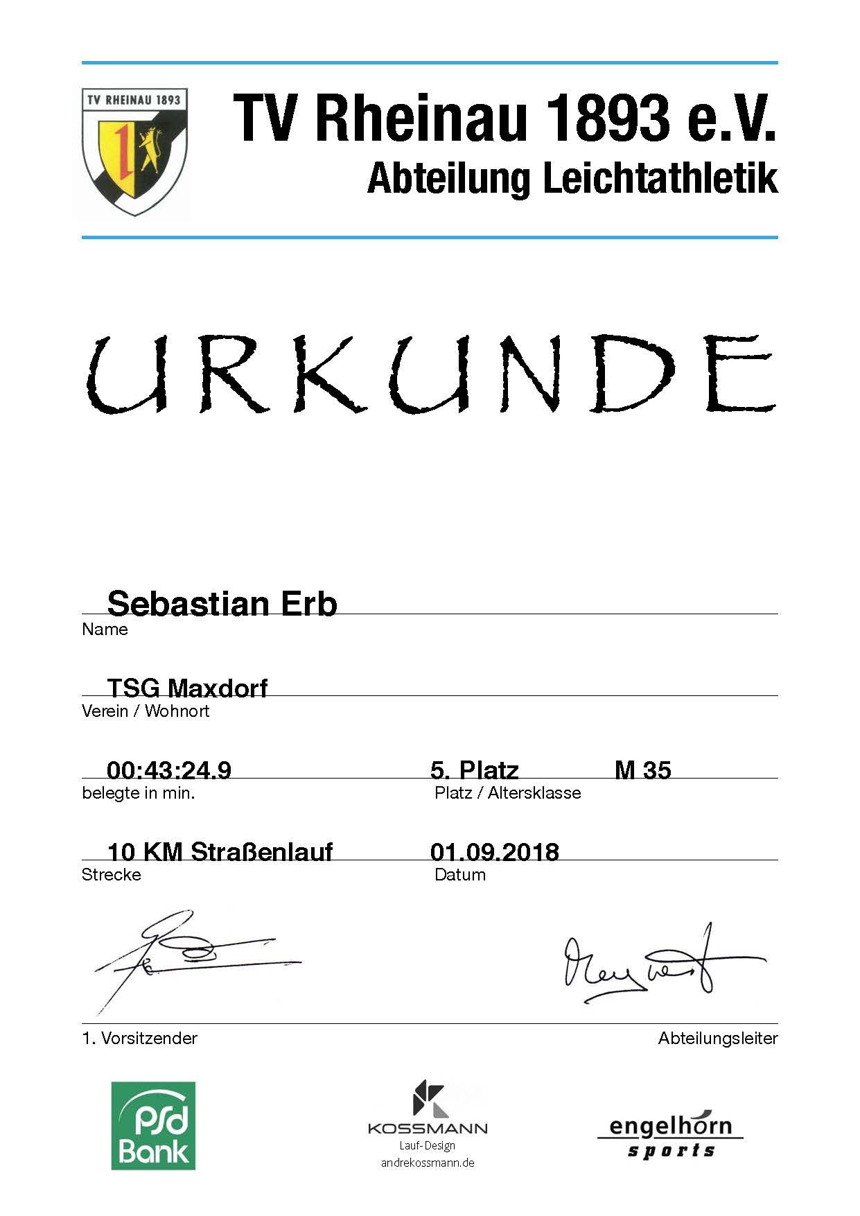 Urkunde 34. Mannheimer Straßenlauf TV Rheinau